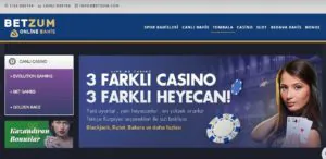 Casino alanında ise ezugi firmasına ait HD kalitede oyunların yer aldığı sitede tüm seçenekler mobil uyumludur. Bu sayede kullanıcılar istedikleri yerden keyifli ve sorunsuz casino oyunlarında para kazanabilirler. Slot oyunları ise diğer alanlara göre farklı bir ortam olan Betzuma da bu oyunlar gerçeklikleriyle ön plana çıkmaktadır. Konulu olmaları nedeniyle bahis severleri siteye bağlayan slot oyunlarında başarılı olanlara ekstra freespin’ler verilmektedir.